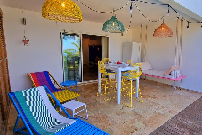Vous pourrez accéder à la belle terrasse en travertin de 25 m² depuis le séjour. Vous apprécierez la magnifique vue sur l'océan et sur la piscine de la résidence. Pour vos repas, un mange debout pour 4 personnes est disponible. La banquette balançoire et les 2 transats seront idéales pour vos moments détentes.